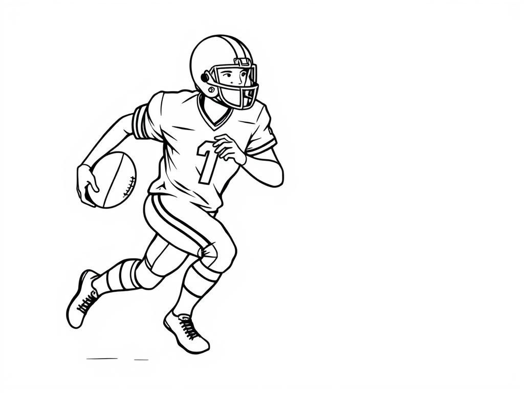 Coloring page of an American football player running with the ball. The player is wearing a helmet, jersey, and cleats, ready for action. American football player coloring page for kids.
